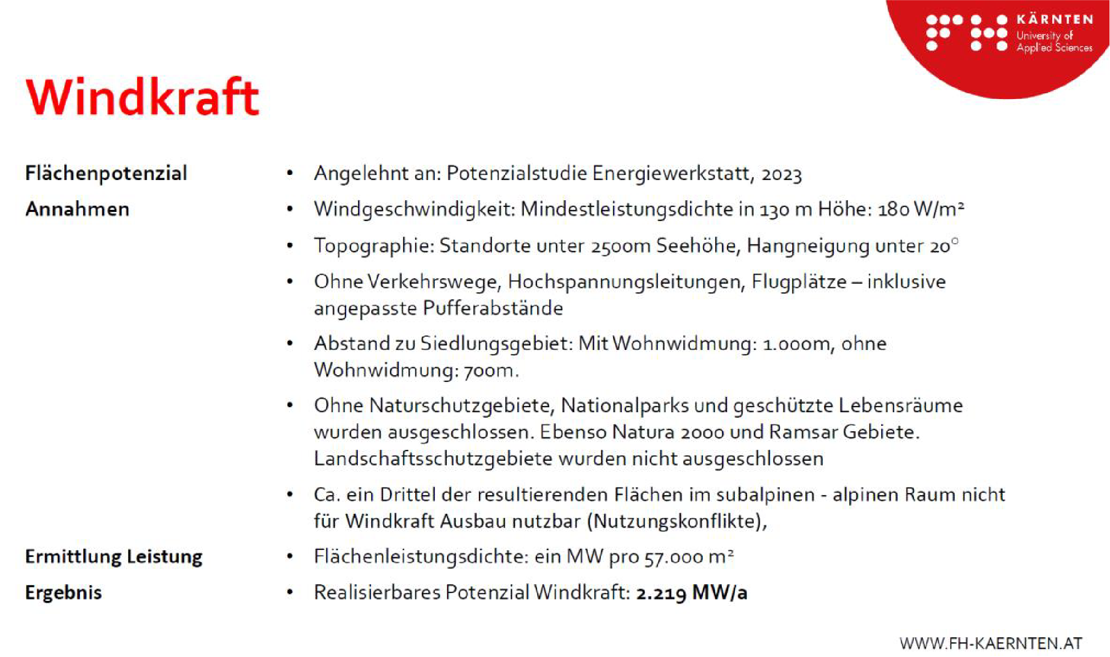 Im derzeitigen Energiestrategieprozess des Landes Kärntens findet sich nachfolgend angeführte Folie. Dort ist ein realisierbares Windkraftpotential von 2.219 MW für Kärnten angegeben.